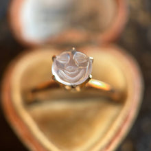 An incredible carved moonstone moon face ring in a rosy 9k gold.