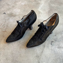 Gorgeous silk beaded shoes circa 1910s. They lace up with a silk ribbon which I believe to be original. The heels are embossed and have a faded iridescent shimmer to them!