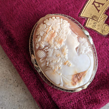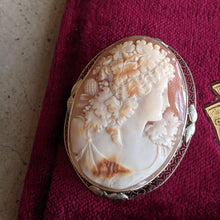 Gorgeous, large carved shell cameo brooch and pendant featuring Dionysus, also known as Bacchus, or one of the deity's followers, wreathed in grape vines.