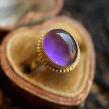 Circa 1930s-1940s, this 14k gold ring features a mesmerizing amethyst cabochon.