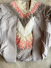 This stunning piece has the most beautiful color scheme of grey, coral, and cream. It is just as beautiful inside as it is outside, fully lined with silk and covered boning.