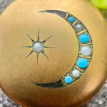 Stunning gold filled celestial locket with a turquoise and pearl crescent moon and pearl star. It's a lovely piece but even more special because inside the locket are two locks of hair!
