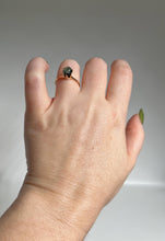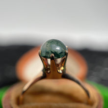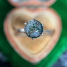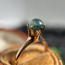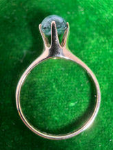 Gorgeous moss agate ring set in 10k gold circa first half of the 20th century. Agates are so fabulous and diverse, but there's something extra special about moss agate. Tiny little tendrils of green "moss" seem to float inside this mesmerizing cabochon.