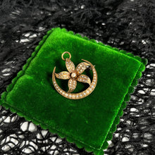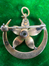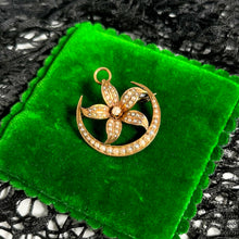 Elegant crescent moon and flower brooch and pendant in 14k gold studded with seed pearls, circa 1900s-1920s.