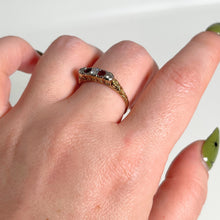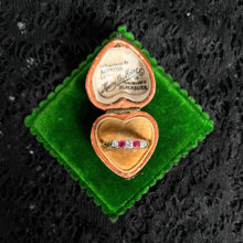Gorgeous "London Bridge" style ring circa early 20th century featuring two beautiful, juicy rubies and three old cut diamonds.