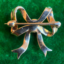 Incredibly sweet and very unique, this 14k gold bow brooch dates from around the early 1900s and features beautiful pink coral and seed pearls.