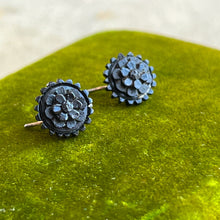 Intricate carving of a flower in the center of each earring. The flowers appear to be forget me nots, which were a symbol of love and remembrance.