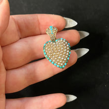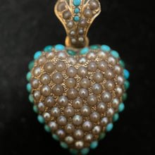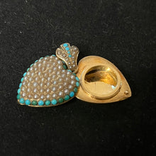 Stunning puffy heart locket in 14k gold encrusted with pearls and turquoise cabochons. Circa mid 19th century.