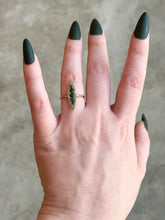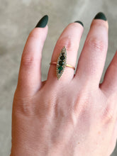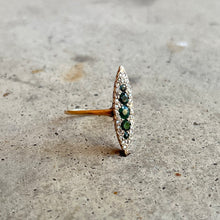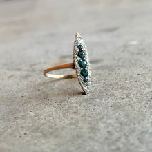 Gorgeous gold ring with emeralds surrounded by old cut diamonds. Dates from around the early 1900s.