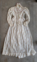 Hook and eye closures at the skirt waist, milk glass buttons on the inner bodice down the center front with hook and eye closures over top. Bodice and skirt connect at the back with a row of hooks and eyes. Skirt is full/pleated at the back with a ruffle at the hem.