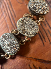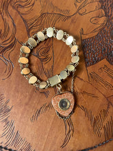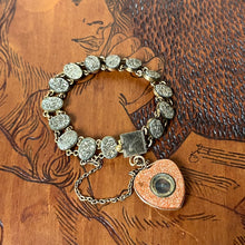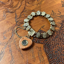 This is an incredibly unique bracelet! I have never seen one quite like it. The bracelet itself is gold filled with natural pyrite stones. The clasp is engraved with a petite bird, possibly a swallow. And attached to the clasp is a goldstone heart compass!