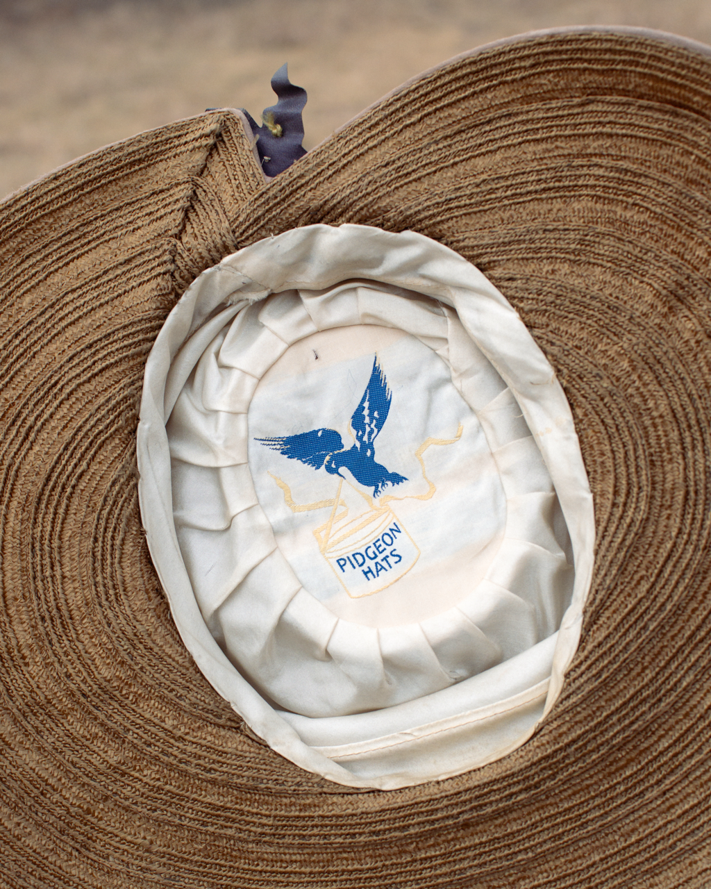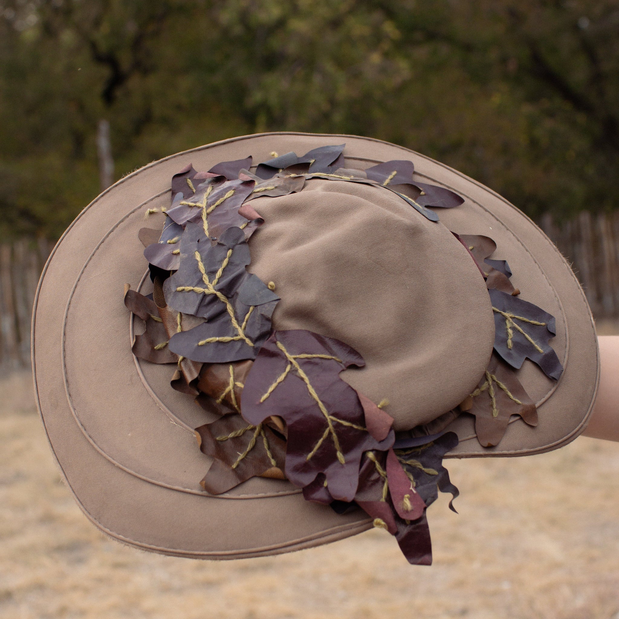 The hat is a fawn brown and the leaves are varying shades of brown and burgundy.