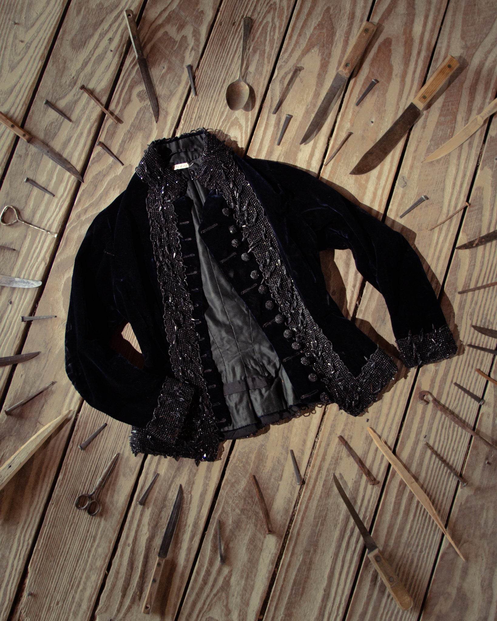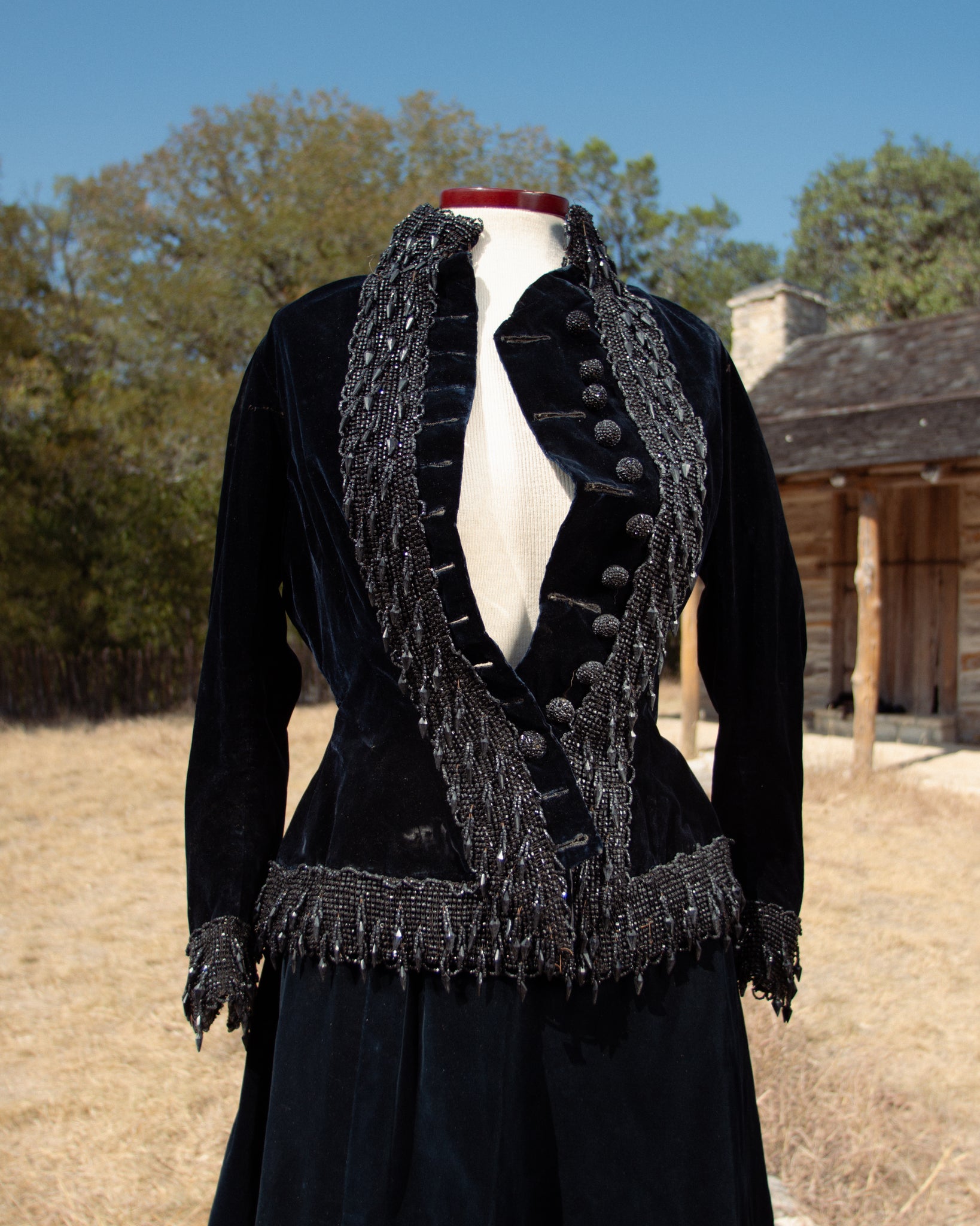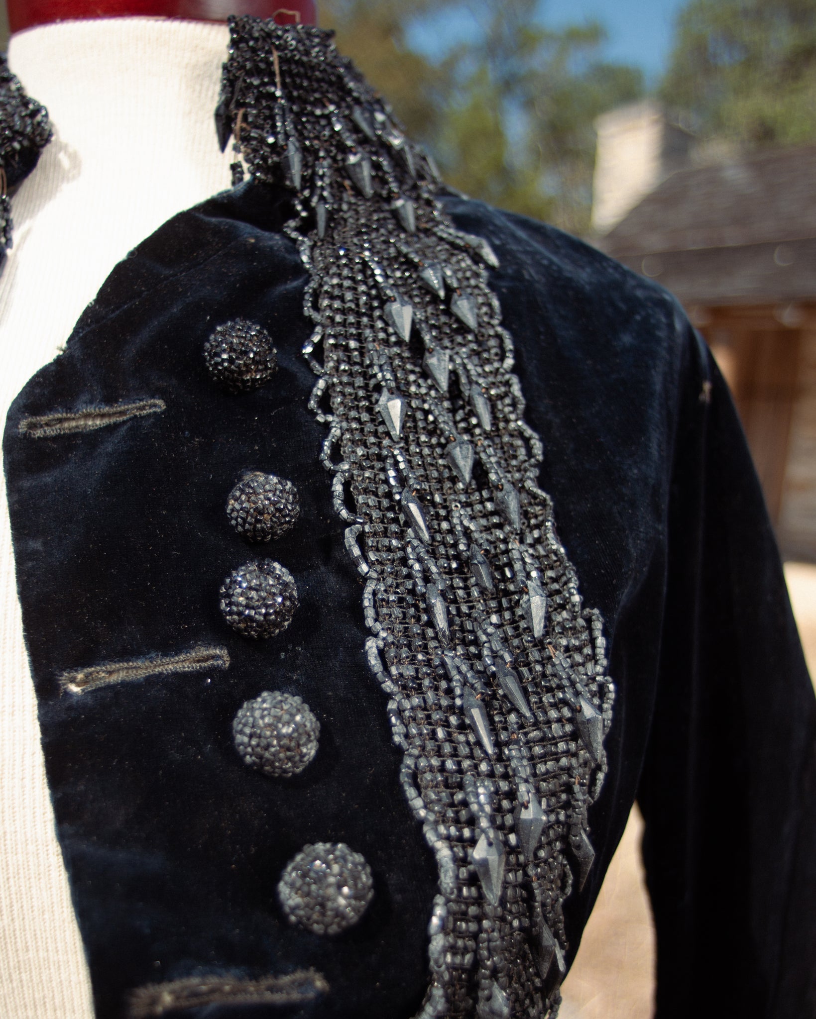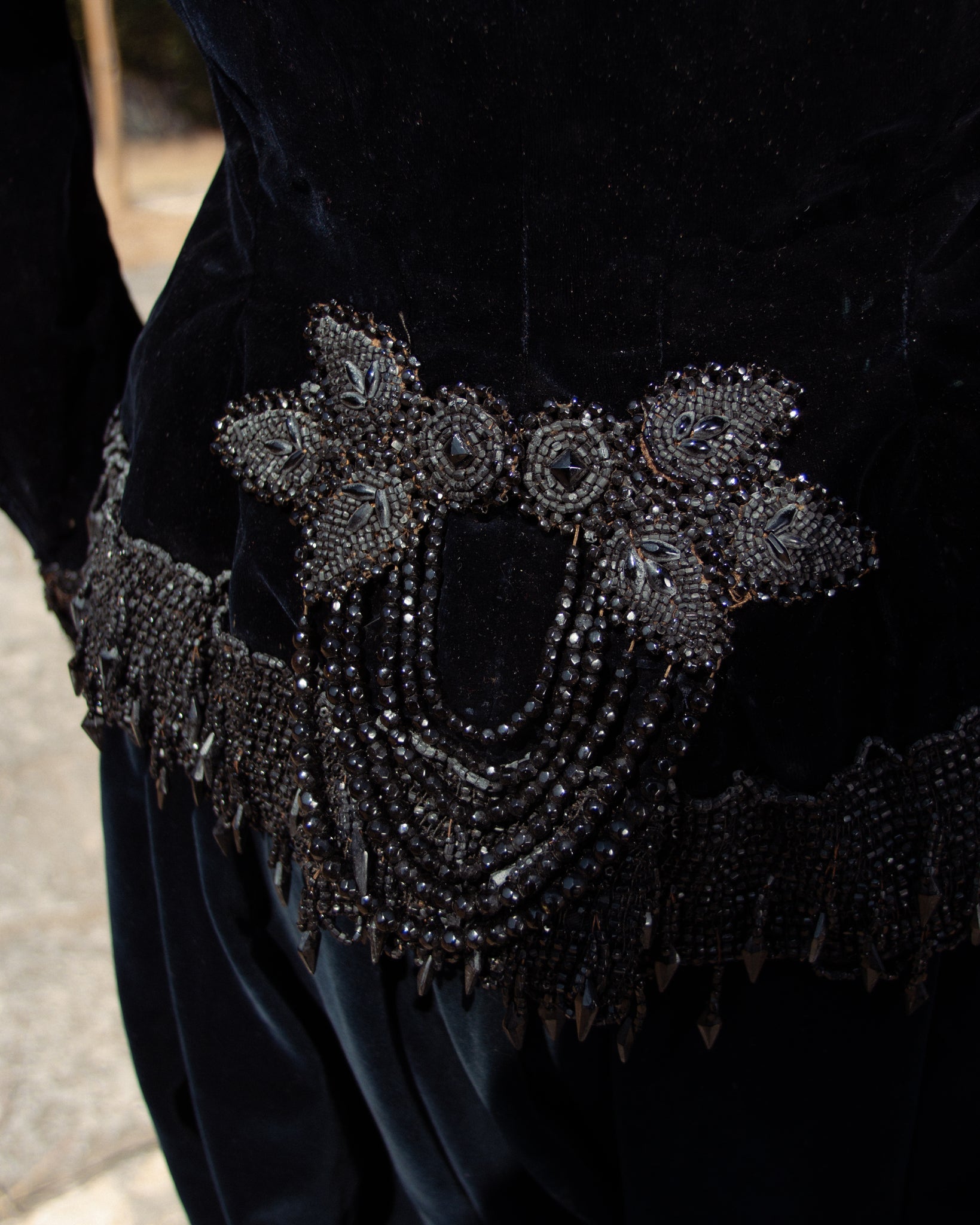 Stunning black velvet beaded bodice circa 1880s. The details on this piece are fantastic! It is also quite heavy from the intricate glass beading.
