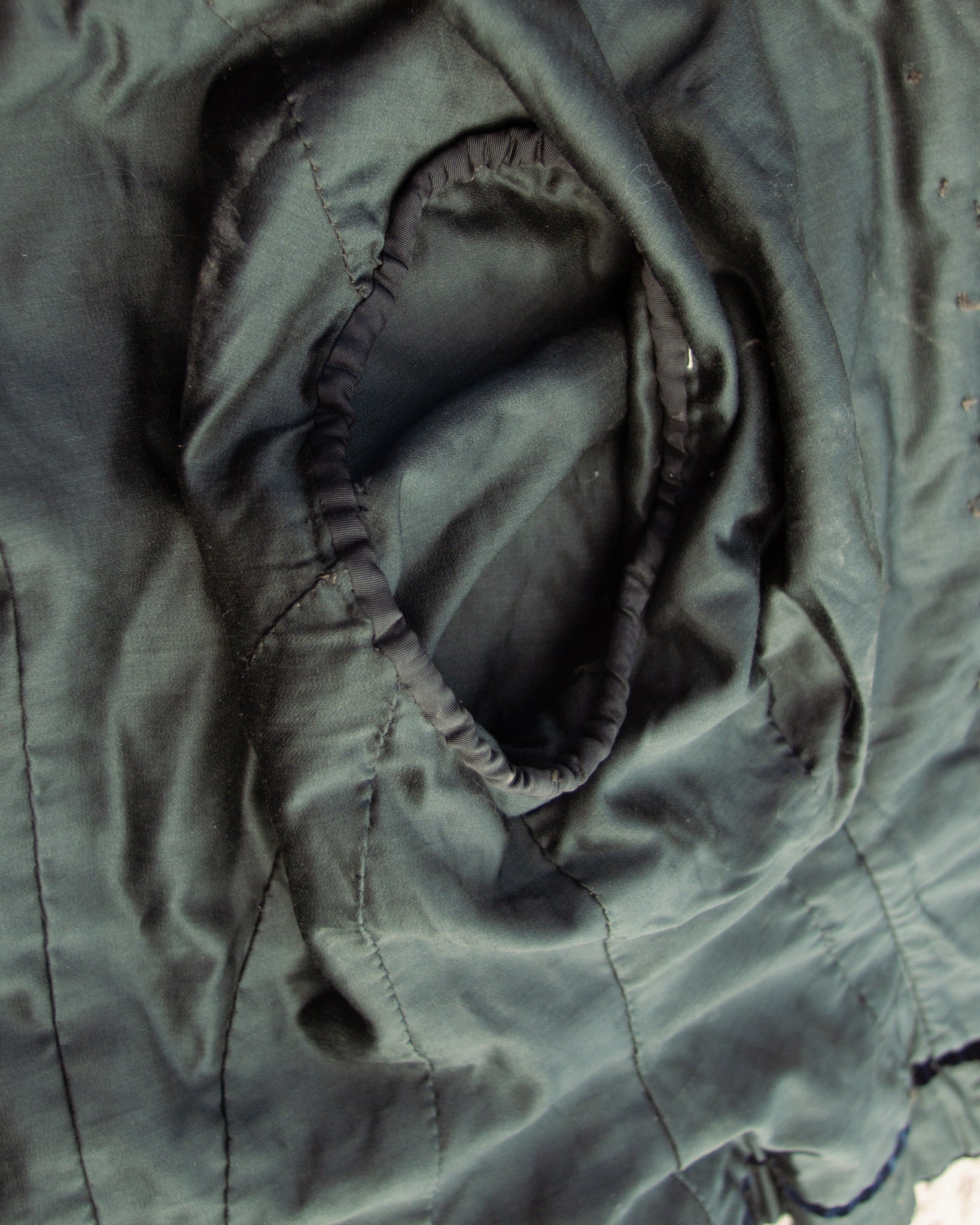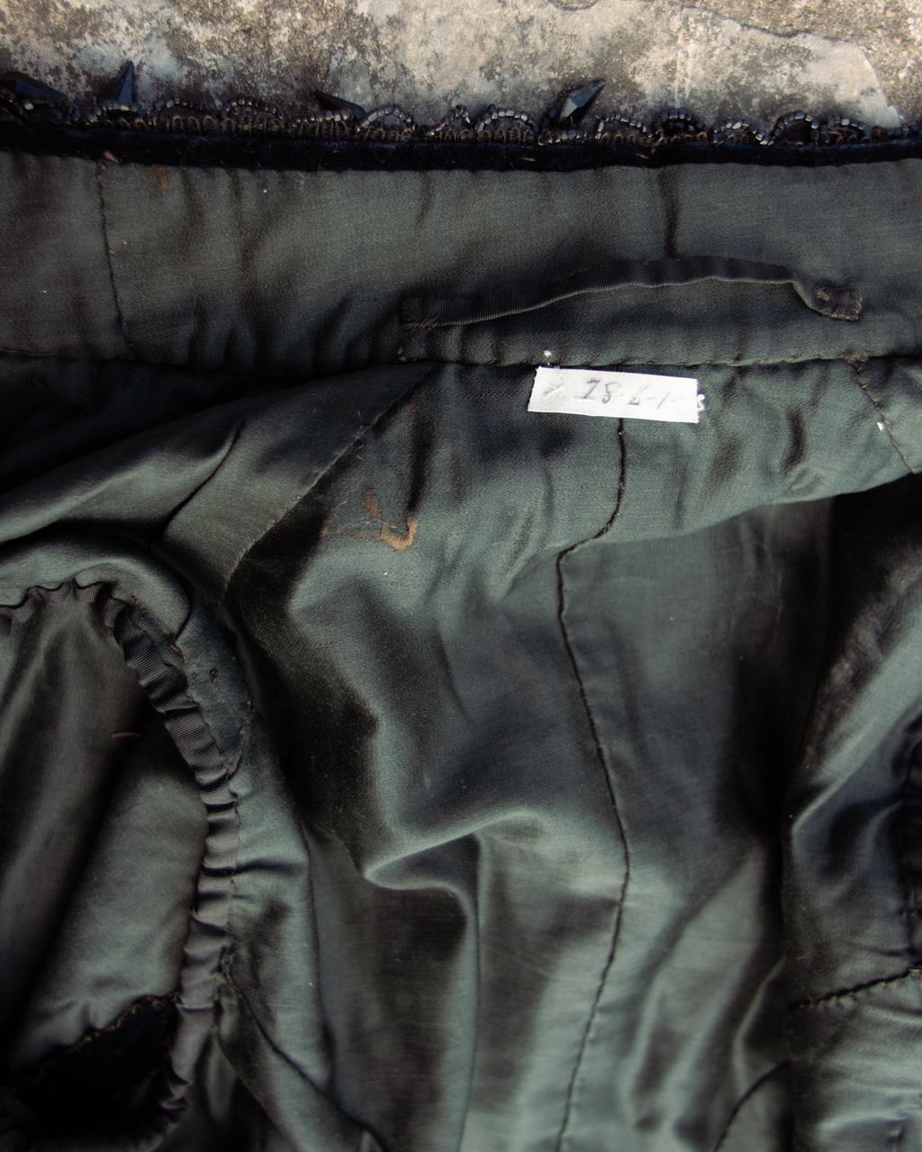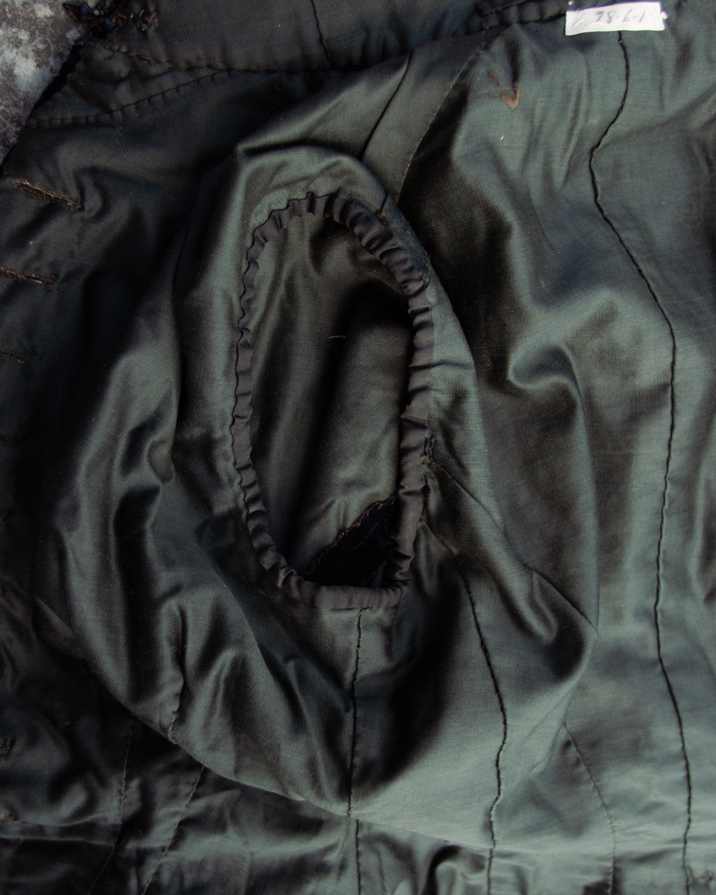 Lined with cotton or blend. A small white tag is present from the catalog of the previous collection from which it was deaccessioned.